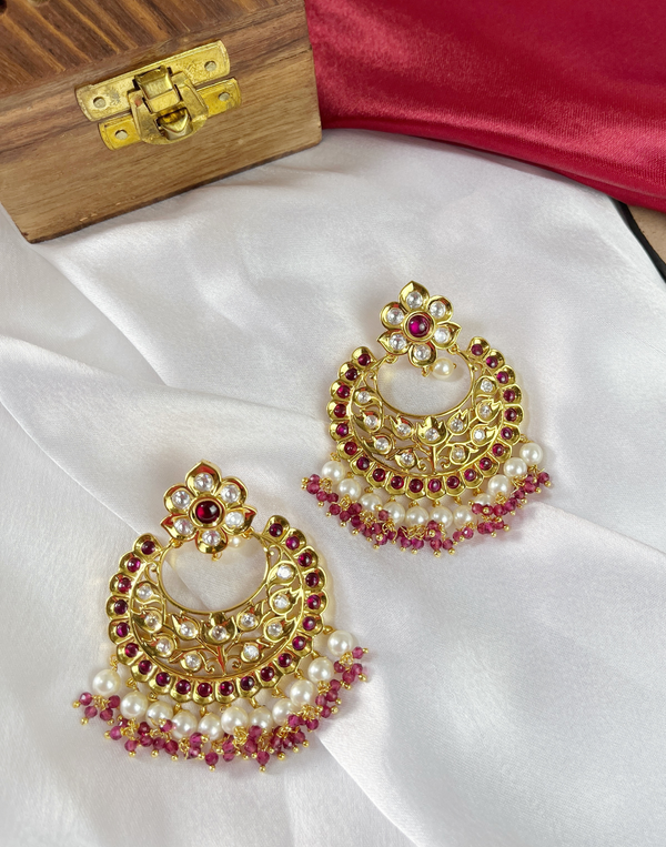 Inspired by regal heritage, the Royal Noor Chandbali earrings showcase an exquisite blend of high quality kundan, ruby-hued stones, and delicate pearls. The floral stud gracefully complements the crescent-shaped design, making these earrings a perfect choice for weddings and festive occasions. A timeless piece for a truly majestic look.