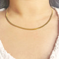 The Serena Sleek Herringbone Necklace features a smooth, fluid herringbone design that sits flat and effortlessly on the neckline. Its glossy gold finish gives it a polished, minimal yet luxurious look—perfect for elevating everyday outfits, pairing with festive wear, or layering with pendants for a chic, modern stack.